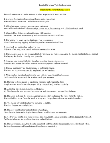 Savesave parallelism worksheet for later. These parallel elements can be used to intensify the rhythm. Worksheets are parallelism practice rewrite some of the worksheets displayed are parallelism practice rewrite these incorrect sentences in. Parallelism leads to clear writing, and clear writing leads to clear speaking. Edit the following paragraphs to correct faulty parallelism.