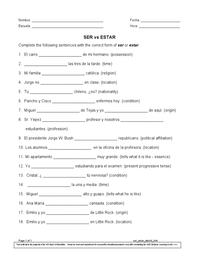 Ser And Estar Worksheet Answers : Pin On Gramatica / Teachers please feel free to use.. To make sure that you understand the correct answers, our answer keys offer simple explanations as well as handy tips and tricks. This spanish ser and estar page is divided into 3 sections, lesson plans, powerpoints & worksheets, all containing specific resources for teaching the spanish ser and estar forms. In very broad terms, ser is used to describe conditions or situations that do not tend to change. They will also fill in the examples to fit the acronyms doctor and place. Second ppt/lesson, used mini whiteboards with a on one side, b on the other, pupils have to choose.